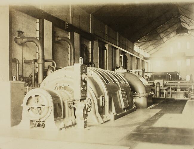 15,000 kW Metropolitan-Vickers-Thompson 3,000 .p.m. 6,600 V AC 50 cycles/sec 3-phase Turbo-Altenator Set installed by the State Electricity Commission of Victoria (SECV) in the engine room at Melbourne Electric Supply Co's Green Street Power Station, Richmond, Victoria. The unit was first activated on 7th May 1929.
