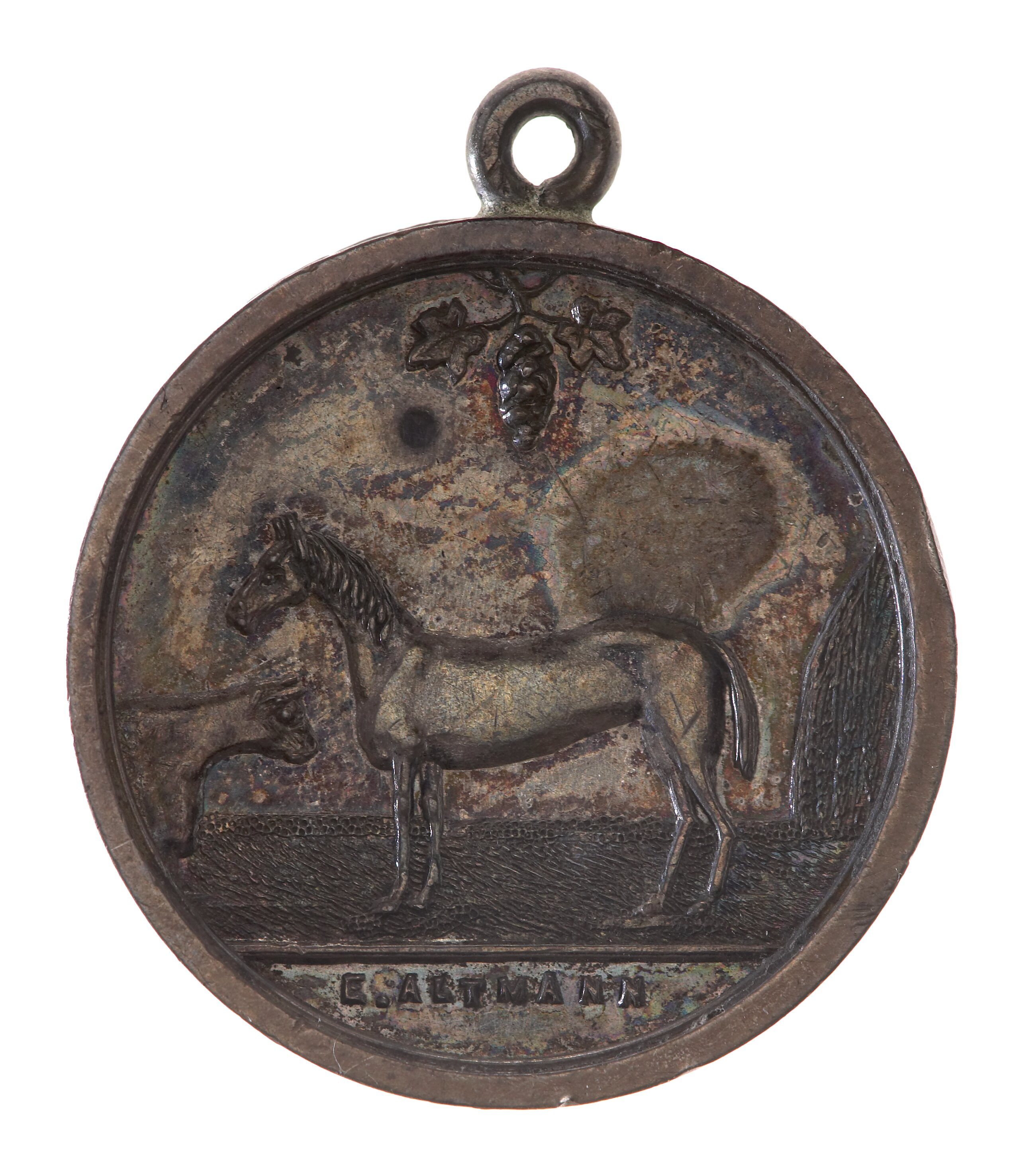 At centre a horse, standing facing left, with the forepart of a bull to left, a hay-stack to right and a bunch of grapes above; in the exergue: E. ALTMANN