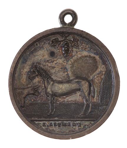 A silver prize medal (22 mm diameter) with loop attached to edge at top. It features a horse, standing facing left, with the forepart of a bull to left, a hay-stack to right and a bunch of grapes above together with details odf the issuing association and details of the winner on the reverse