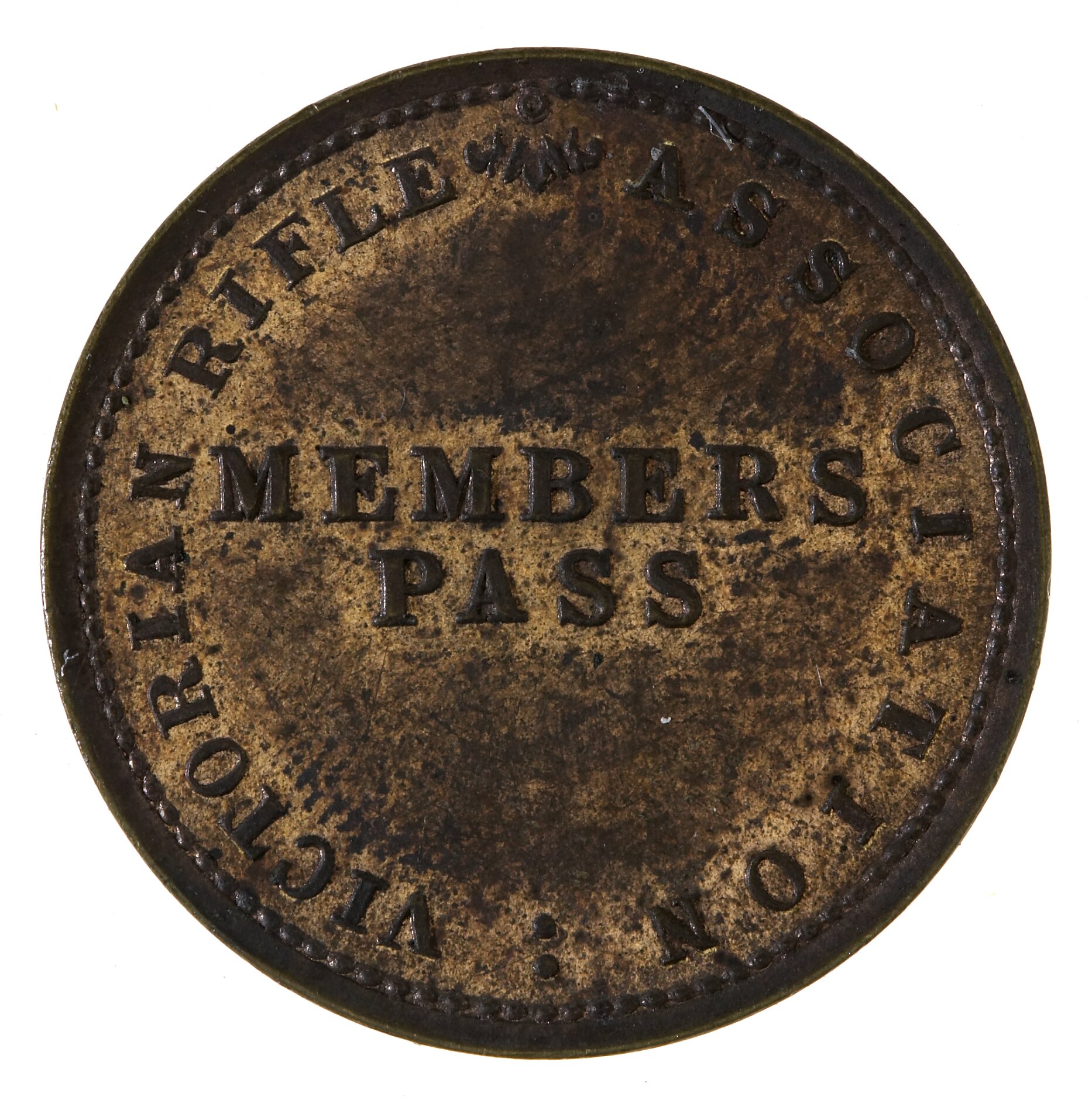 Obverse: VICTORIAN RIFLE ASSOCIATION MEMBERS PASS Reverse: OUR FATHER WHO ART IN HEAVEN HALLOWED BE THY NAME THY KINGDOM COME THY WILL BE DONE ON EARTH AS IT IS IN HEAVEN GIVE US THIS DAY OUR DAILY BREAD FORGIVE US OUR TRESPASSES AS WE FORGIVE THEM THAT TRESPASS AGAINST US LEAD US NOT INTO TEMPTATION BUT DELIVER US FROM EVILFOR THINE IS THE KINGDOM THE POWER & THE GLORY FOR EVER & EVER AMEN