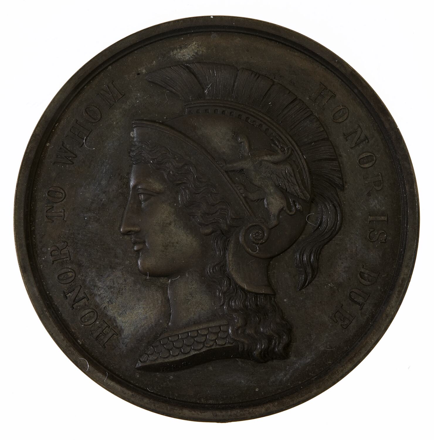 HONOR TO WHOM HONOR IS DUE around a classical head facing left Under neck truncation: H.R.S.