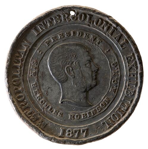 Other Details: A medal struck in white metal to commemorate the Metropolitan Intercolonial Exhibition, Sydney. It depicts the Intercolonial exhibition building constructed in 1870 (demolished 1954) and has a portrait of Sir Hercules Robinson, president of the 1877 Exhibition Committee. The medal is holed and probably originally had a loop with ribbon as it was intended to be worn. Sir Hercules had been governor of New South Wales since 1872. Robinson was not content to be a mere figurehead, and his active role in politics saw him play a valuable role in the development of responsible government in New South Wales. However, his attitude to colonial institutions was essentially paternalistic, more suited to a crown colony than a semi-independent, albeit fledgling, democracy. He tended to antagonize parliament, but he was publicly popular, in part because he had developed a flair for public speaking in which he extolled popular themes such as manly sports.