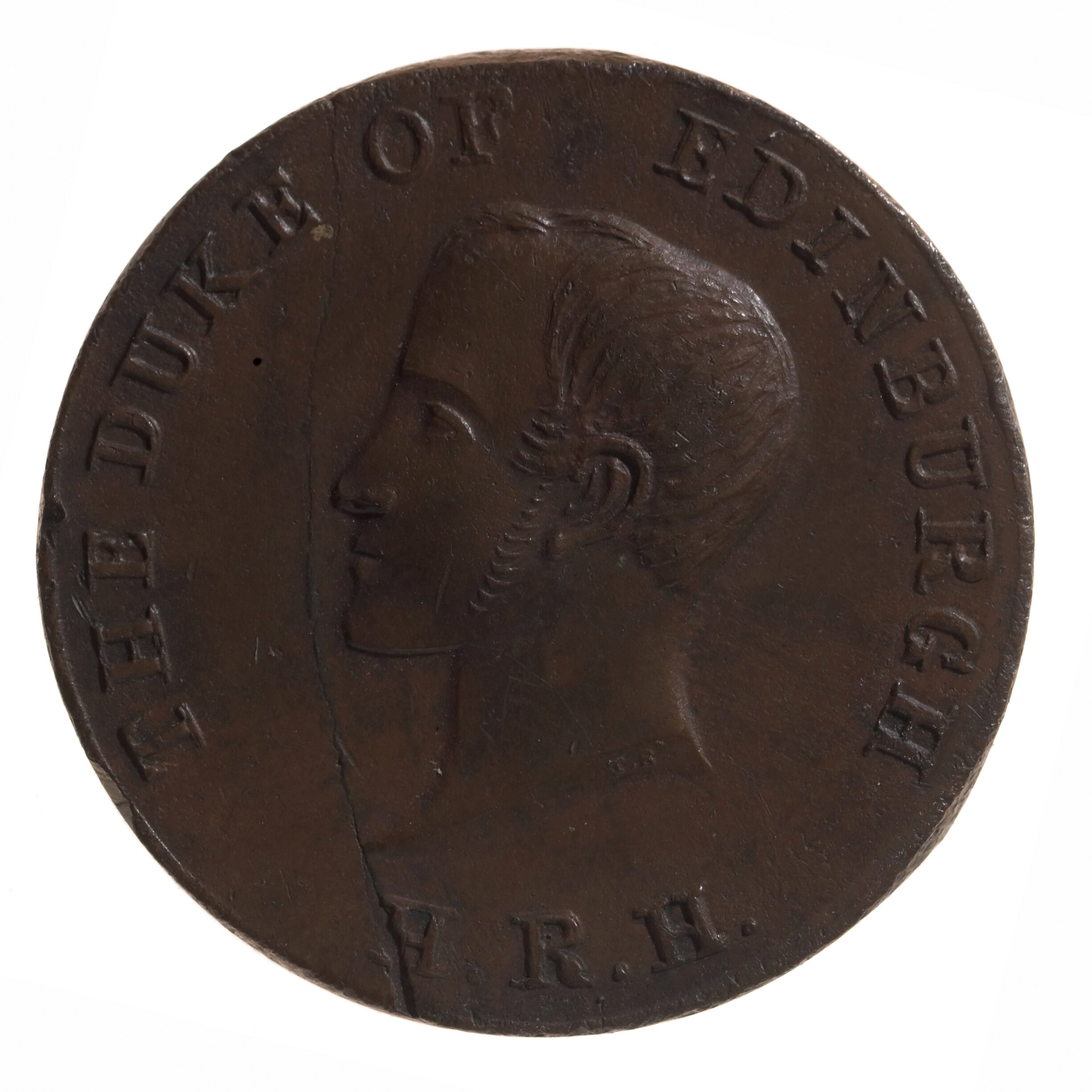 Head of Duke of Edinburgh, bare, facing left; initials T.B. raised on neck truncation; around, THE DUKE OF EDINBURGH; below, H.R.H.
