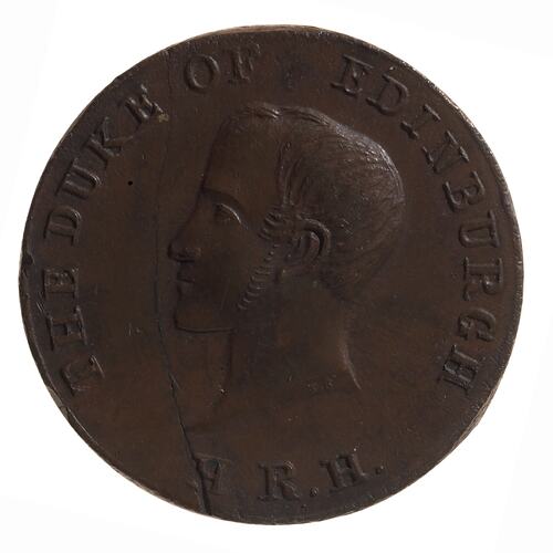 Plain (edge) THE DUKE OF EDINBURGH/H.R.H.; Head of Duke of Edinburgh facing l. Initials T.B. on neck truncation (obverse) IN/COMMEMORATION/OF/PRINCE ALFREDS/VISIT/TO SYDNEY/JANUARY 21/18 68 Wreath and crown in centre top (reverse)