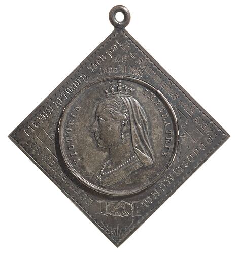 Bust of Queen Victoria veiled and wearing small crown, facing right; around, VICTORIA IMPERATRIX Engraved on mount; 616 MEN RETURNED TOOK PART IN 4 SKIRMISH ES WITH ARABS/COST OF EXPEDITION TO NSW 130,000/RETD/JUNE 20 1885 Hands shaking engraved at base of mount