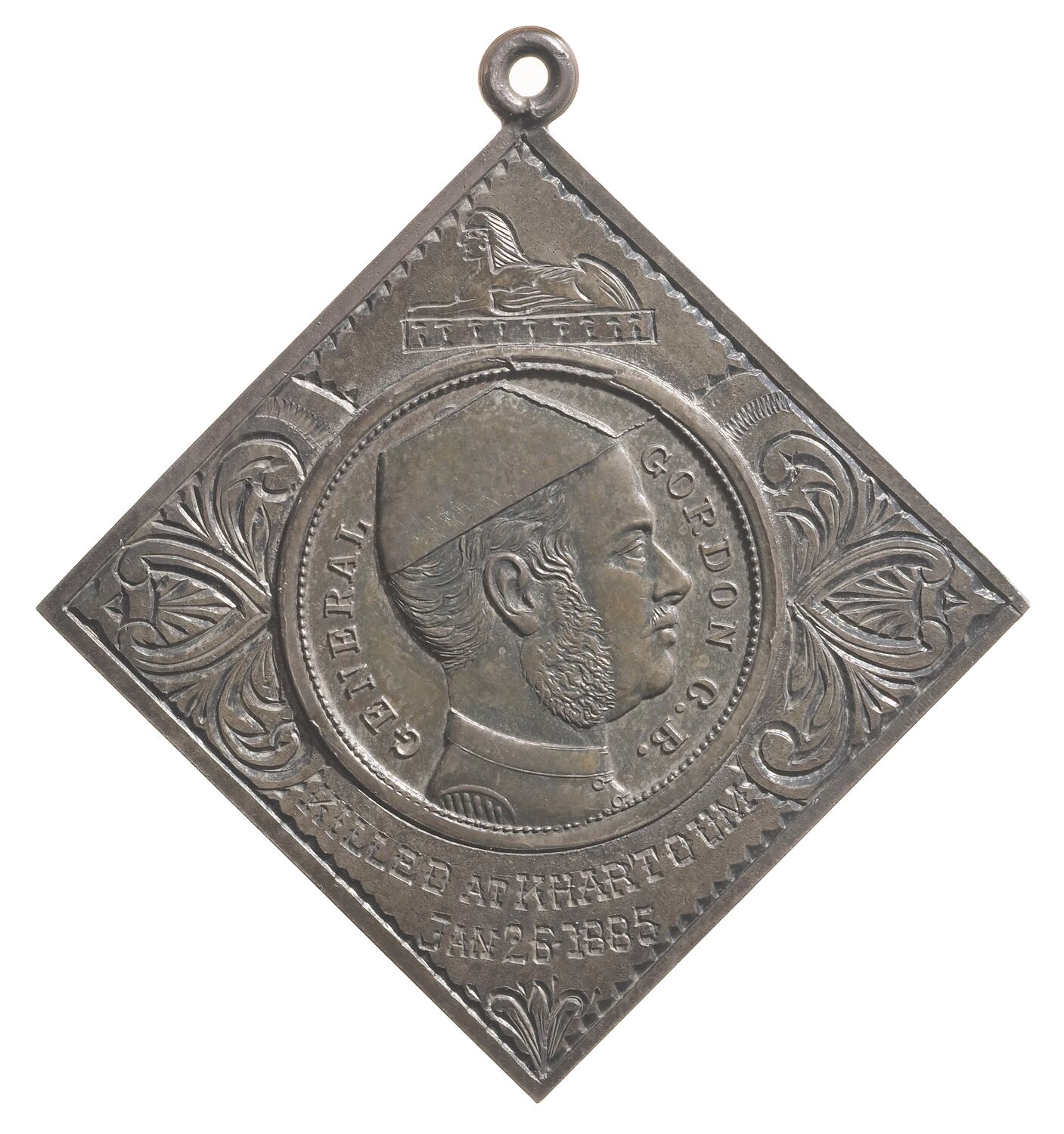 Bust of General Gordon wearing cap facing right; around, GENERAL GORDON C.B. Set in ornate silver mount with sphinx above and engraved below, KILLED AT KHARTOUM / JAN 26 - 1885