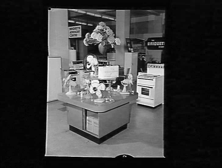 Showroom with electric fans. Stove and refrigerator.