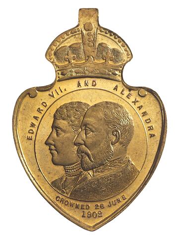 At centre, within line circle conjoined busts of Edward VII and Queen Alexandra; around, EDWARD VII AND ALEXANDRA 0; below, CROWNED 26 JUNE / 1902. Struck on a shield shaped flan with a crown and loop at the top