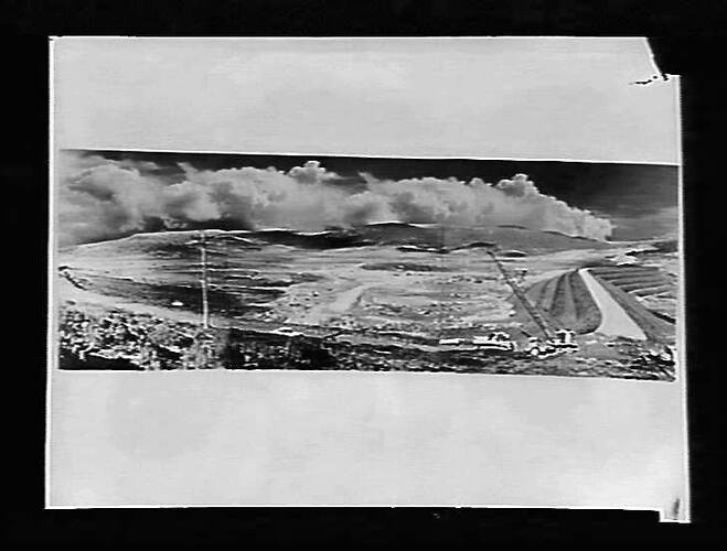 Rocky Valley Dam with smoke from bushfire, April 1959 - panoramic view.