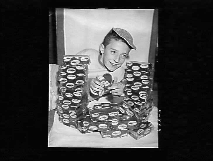 Child with cellophane wrapped briquettes Aug 1959.