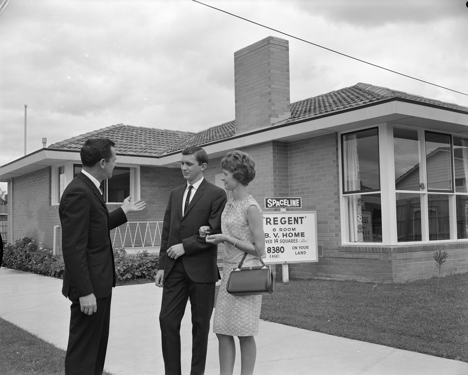 Black and white negative of homebuyers standing out the front of a Regent 6 brick display house with an overhead powerline, 1950s-1960s.