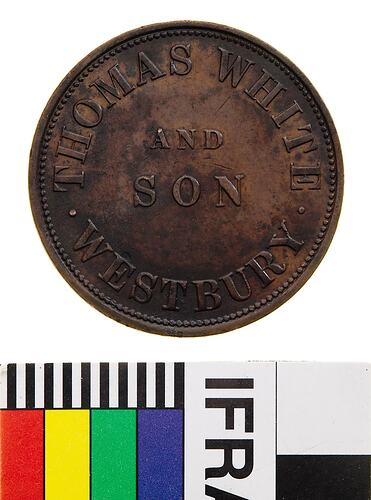 A round copper token (34 mm diameter) featuring the name and Town that issued the tokens: Thomas White and Son, Westbury. The reverse depicts a kangaroo and emu facing each other and gives the date of issue, 1855.