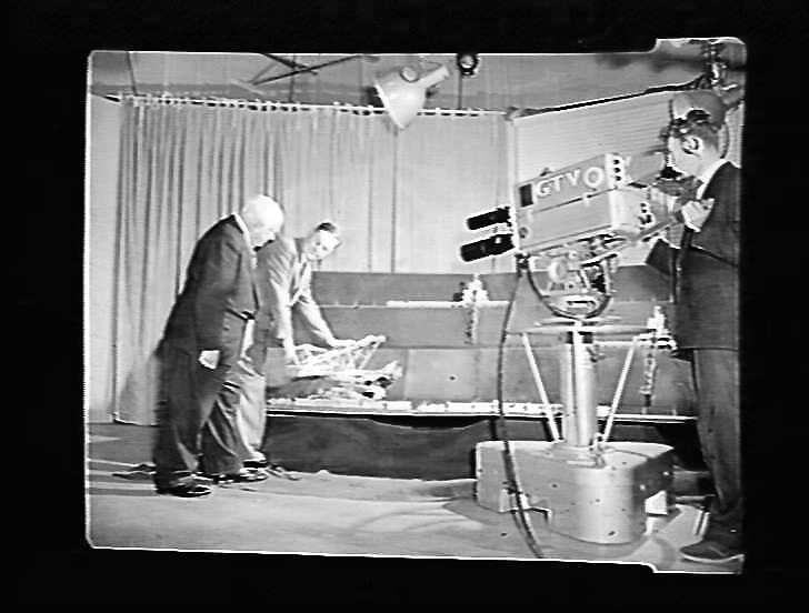 State Electricity Commission (SEC) chairman. W. H. Connolly, and Professor Brown appearing on television with model of coal dredge.