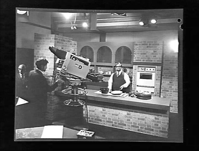 Advertising, Cooking Demonstrations, Cooking Utensils, Display Kitchens, Electrical Appliances, Food Preparation, Stoves, Television Cameras, Television Studios