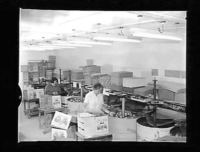 Image of workers hand-packing apples from the 'rotary bin' into waxed cardboard boxes at the apple orchard owned by the Burgi Family in Wandin, Victoria, late 1960s- early 1970s. The cartons have the Burgi brand name "Blue Vee Fruit" on them, one of the first domestic market brands to be trademarked. The cartons also depict the controlled atmosphere information which is a way of storing fruit in addition to cool storage.