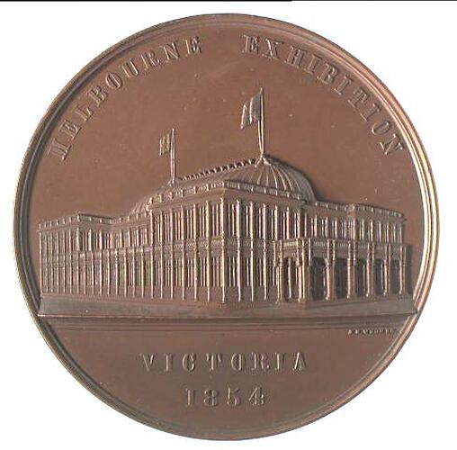 Other Details: A bronze prize medal (64 mm diameter) awarded to the St. Kilda artist Henry Davis by the Melbourne 1854 Exhibition. It features a view by J.S. Wyon, whose name appears at the top right of the exergue, of the specially built exhibition building as it would have been seen from the Flagstaff Gardens. This medal was awarded for an entry of four water colour drawings: 1. Highland Snow Storm; 2. Australian Dust Storm; 3. Summer Day at Windermere; 4. Wreck on the Fern Island. The Exhibition opened on 17 December 1854 and ran for 30 days. Around 40,000 people attended - half of Melbourne's population. The exhibition building, at the site of the later Royal Mint in William Street, was based on the design of the Crystal Palace in London, which had hosted the Great Exhibition only three years earlier, in 1851. Melbourne's exhibition building had 200 ornamental windows and was lit by 306 gaslights. The exhibition included a modest 428 exhibits, mainly local industrial and agricultural products. Some of these exhibits went to Paris for the 1855 Exhibition.