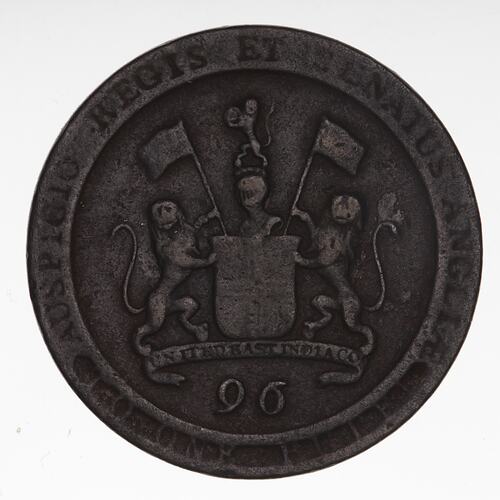 Within a broad rim, the company arms, a quartered shield (oval crowned Royal shield in the first quarter of the shield (worn) else plain); crest of a helm with lion holding the Imperial Crown; lion supporters, each holding a banner charged with a cross; below incuse on ribbon, UNITED EAST INDIA CO.; below ribbon, 96; on rim below, TO ONE RUPEE; around above, incuse on rim, the motto, AUSPICIO REGIS ET SENATUS ANGLICAE