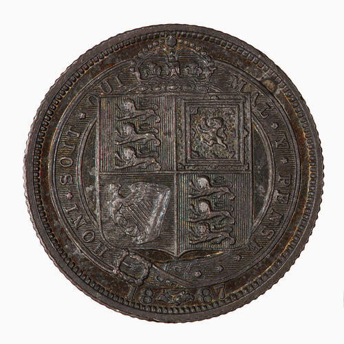 Struck as part of a new coinage in gold and silver to commemorate the Golden Jubilee of Queen Victoria, 1837-1887. The coins all shared a new 'Jubilee' obverse of the Queen by Boehm, adapted from his own Jubillee medal. The new obverse proved unpopular but was used until 1893. The reverse is adapted from the shilling of George IV used from 1823 to 1825 but on this denomination the coin was so close to the gold half-sovereign in size and design that it led to wide spread frauds by gilding this coin type and passing it as a half-sovereign. Production of the shield reverse sixpence was quickly stopped and was replace in the same year by a new coin with the words SIX PENCE within a wreath on the reverse with the new Jubilee obverse.