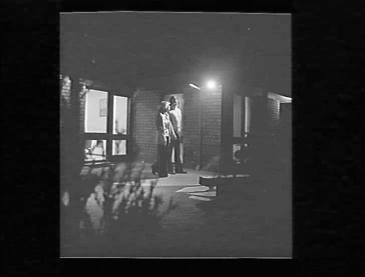 Man and woman at entrance to house, evening.