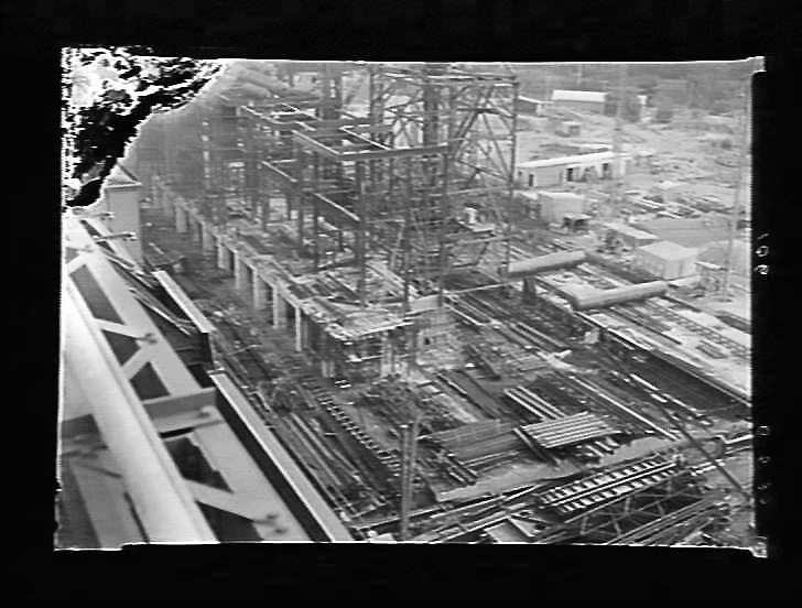 Construction of Yallourn 'B' boiler house, showing installation of steam drums. Image taken from 'A' boiler house roof. Note: The given date seems too late: MM 049291, taken 16 April shows more steam drums installed. (NB: negative damaged at upper left corner).