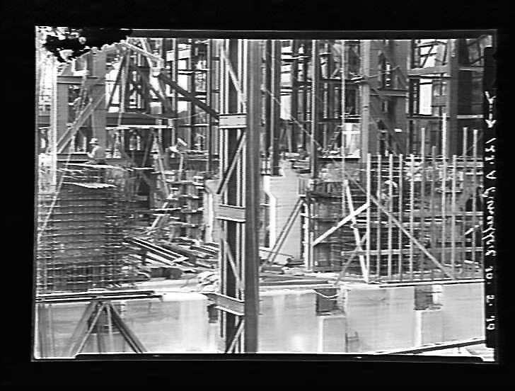 Construction of Yallourn 'B' boiler house, preparing frames for reinforced concrete. (NB: negative damaged at upper left corner).