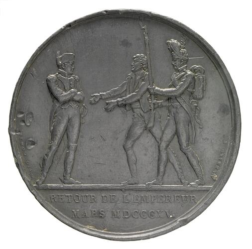 Napoleon standing left presenting himself to the people and the army represented by a soldier and a civilian who welcome him; in exergue, RETOUR DE L'EMPEROR / MARS MDCCCXV.; in small letters, DENON DIR. ANDRIEU.F