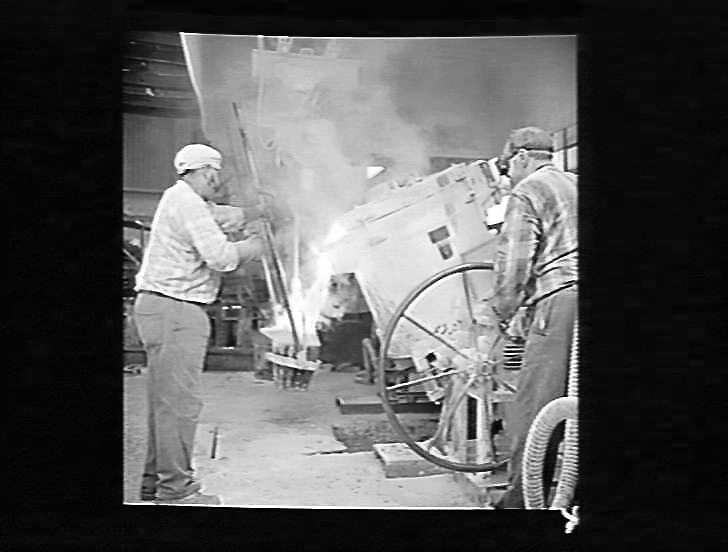 Foundry - two men pouring molten metal.