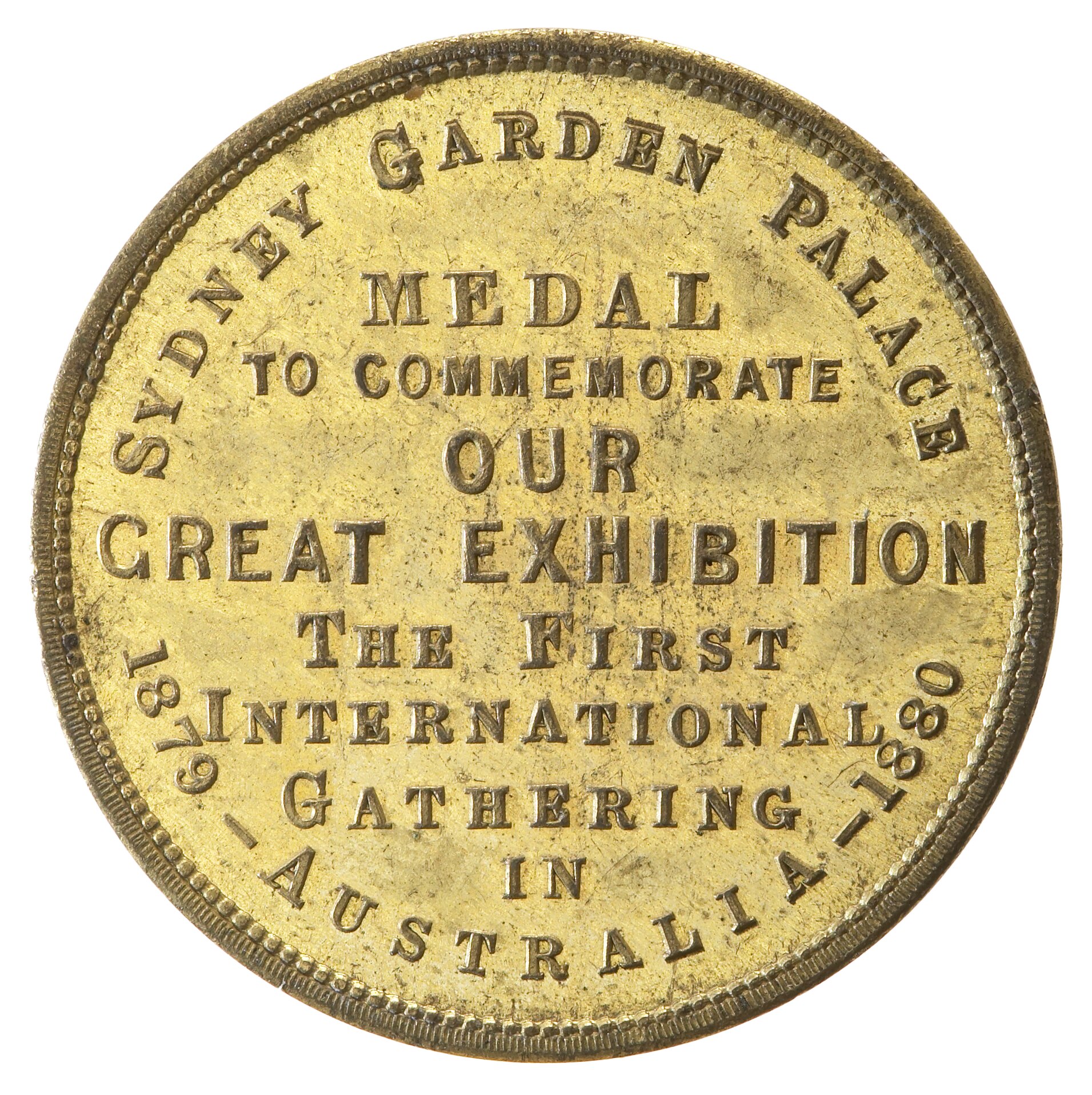 SYDNEY GARDEN PALACE / 1879 - 1880 / MEDAL / TO COMMEMORATE / OUR / GREAT EXHIBITION / THE FIRST / INTERNATIONAL / GATHERING / IN / AUSTRALIA