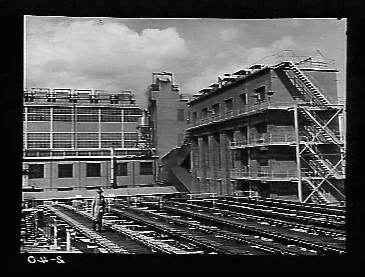 Yallourn briquette works with man on conveyor belt, 1953.