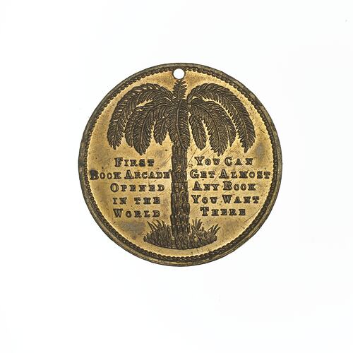 Medal, Cole's Book Arcade, First Book Arcade Opened in Melbourne, circa 1885. This gilt medal is one of a series of medals offering maxims and proverbs issued by E.W. Cole at his Book Arcade. He called the medals 'little missionaries for the spread of educative knowledge' (Dean, 1988, p.36).