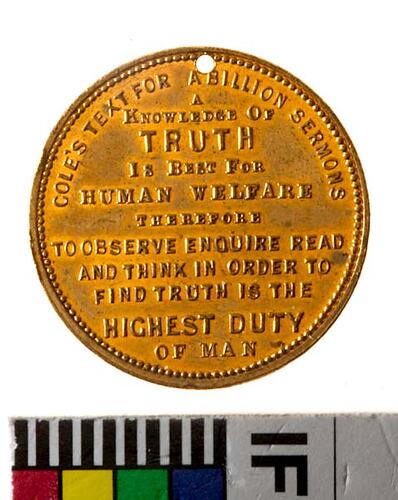 Medal, Cole's Book Arcade, First Book Arcade Opened in the World, circa 1880. This gilt medal is one of a series of medals offering maxims and proverbs issued by E.W. Cole at his Book Arcade. He called the medals 'little missionaries for the spread of educative knowledge' (Dean, 1988, p.36).