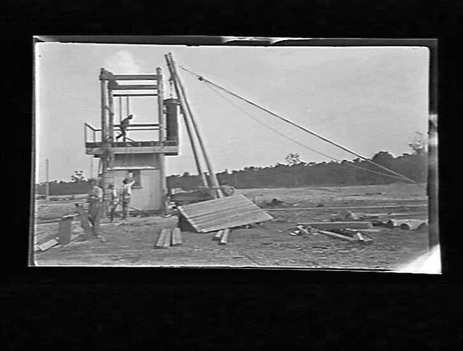 Very early construction at Yallourn Temporary Power Station, lifting transformer to the top of stand.