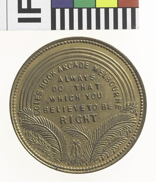 Medal, Cole's Book Arcade, First Book Arcade Opened in the World, circa 1880. This gilt medal is one of a series of medals offering maxims and proverbs issued by E.W. Cole at his Book Arcade. He called the medals 'little missionaries for the spread of educative knowledge' (Dean, 1988, p.36).