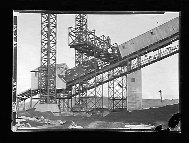 Construction of coal conveyors at Yallourn 'B' power station. (nb negative damaged at lower right corner).