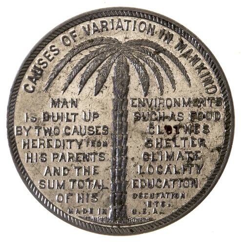 Obverse: CAUSES OF VARIATION IN MANKIND MAN / IS BUILT UP / BY TWO CAUSES / HEREDITY FROM / HIS PARENTS / AND THE / SUM TOTAL / OF HIS ENVIRONMENTS / SUCH AS / FOOD / CLOTHES / SHELTER / CLIMATE / LOCALITY / EDUCATION / OCCUPATION / ETC MADE IN U.S.A. Reverse: HIS SKIN-COLOR / IS CAUSED BY THE / SUN. HE DEGENERATES IN THE ENERVATING / TROPICS. HE EVOLVES / PHYSICALLY STRONGER / IN THE BRACING / TEMPERATE REGIONS FEDERATION OF THE / WORLD MEDALS / ISSUED / BY E.W. COLE / BOOK ARCADE MELBOURNE