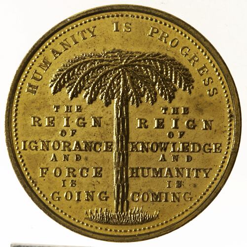 Tree fern in centre; around above, HUMANITY IS PROGRESS to left of fern, THE REIGN OF IGNORANCE AND FORCE IS GOING to right, THE REIGN OF KNOWLEDGE AND HUMANITY IS COMING