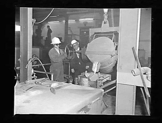 Field officer at work: watching the pouring of molten metal.