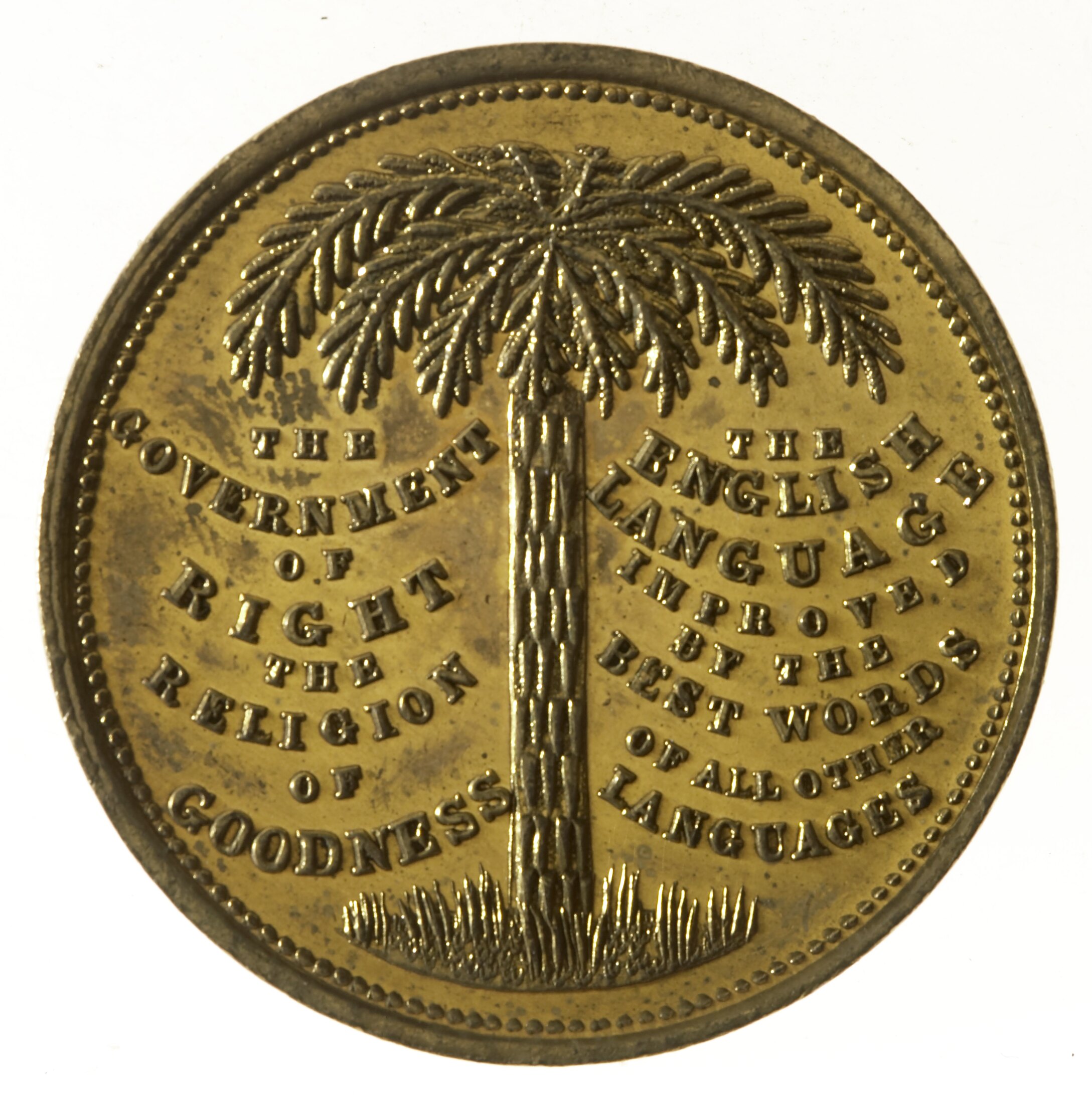 Tree fern in centre; to left of fern, THE GOVERNMENT OF RIGHT THE RELIGION OF GOODNESS to right, THE ENGLISH LANGUAGE IMPROVED BY THE BEST WORDS OF ALL OTHER LANGUAGES