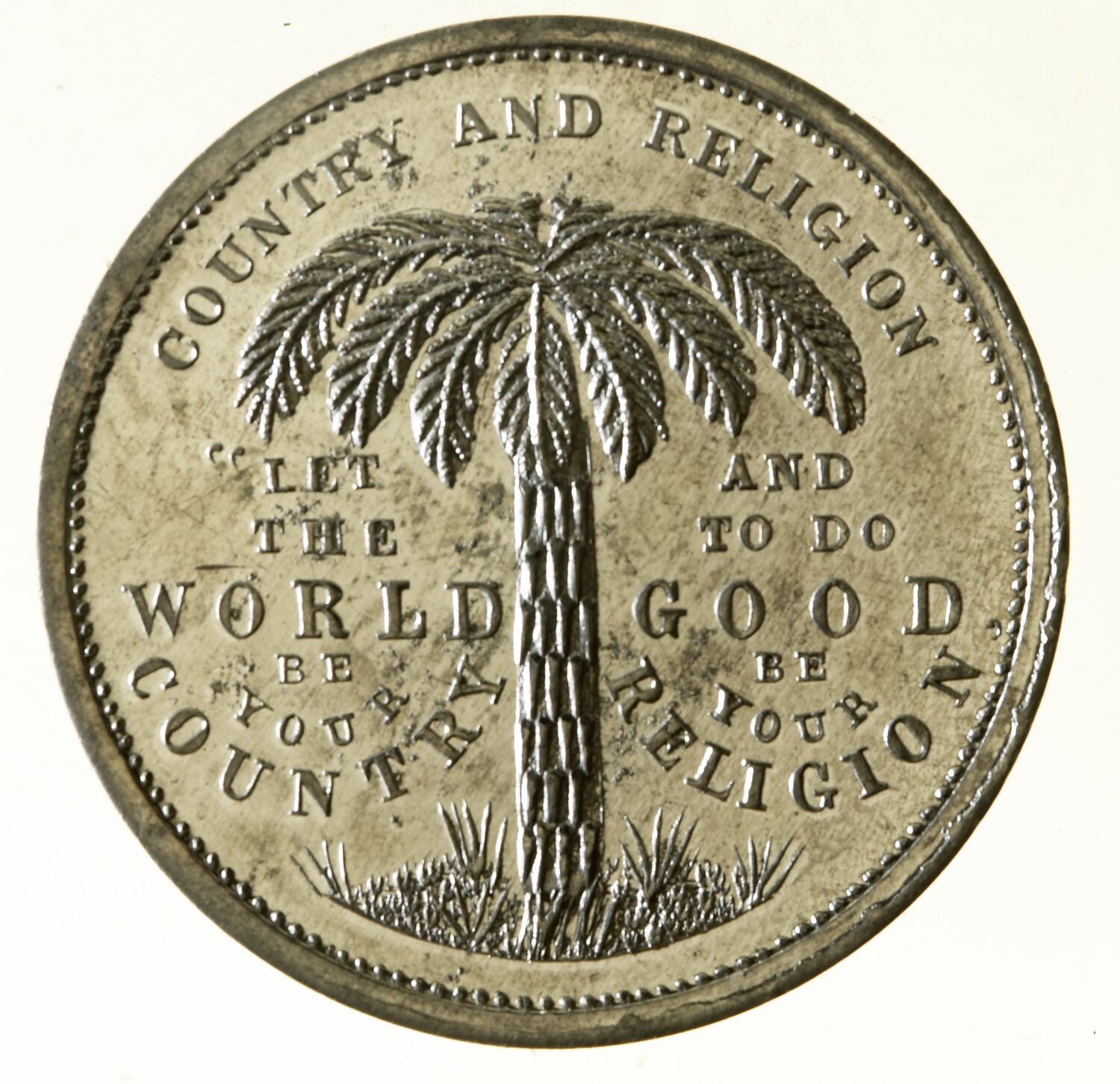 Tree fern in centre; around above, COUNTRY AND RELIGION to left of fern, "LET / THE / WORLD / BE / YOUR / COUNTRY to right, AND / TO DO / GOOD / BE / YOUR / RELIGION