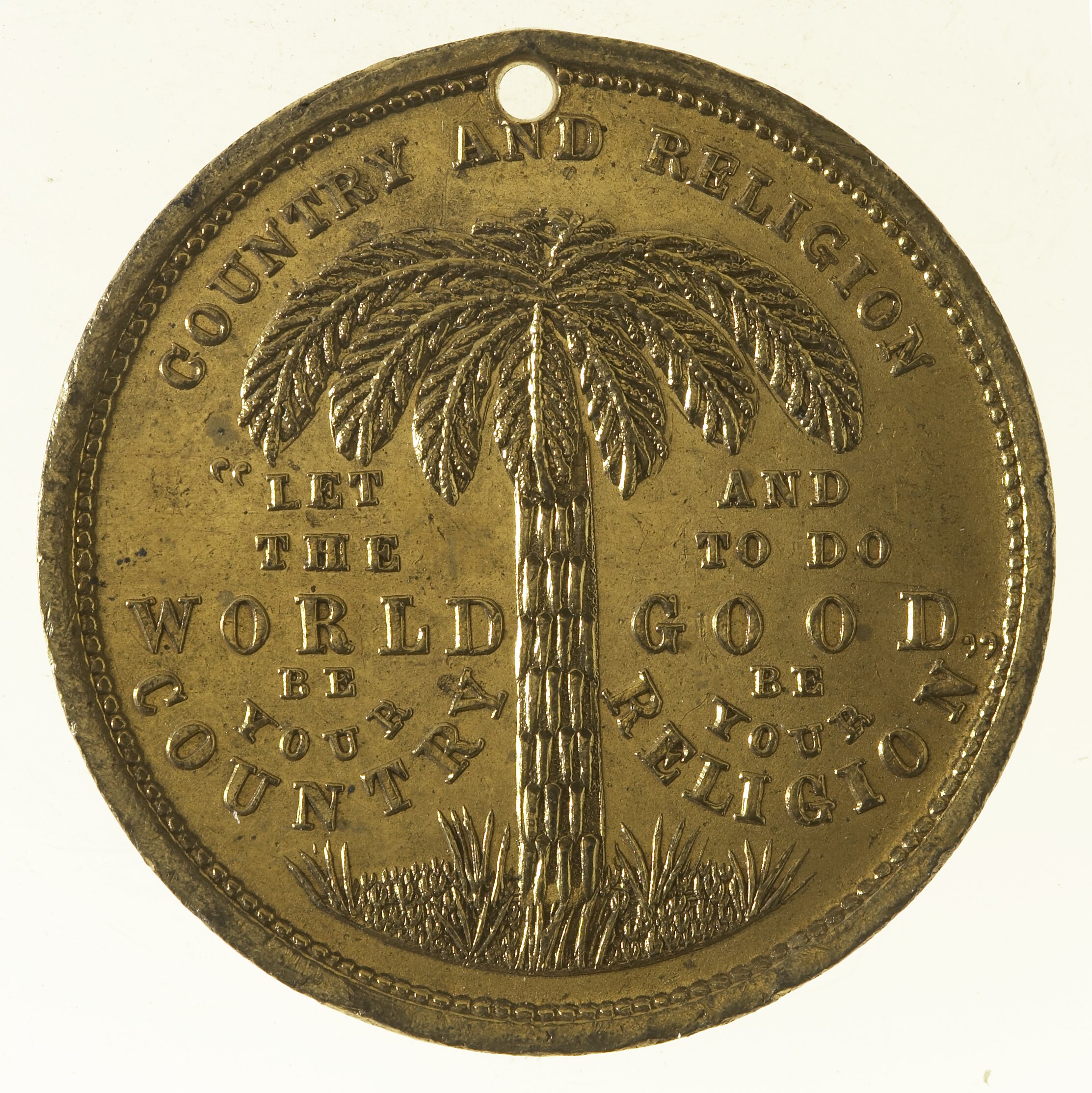 Tree fern in centre; around above, COUNTRY AND RELIGION to left of fern, "LET / THE / WORLD / BE / YOUR / COUNTRY to right, AND / TO DO / GOOD / BE / YOUR / RELIGION