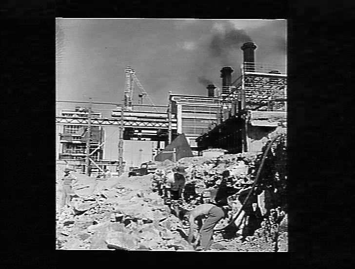 Yallourn Power Station, excavations associated with building 'C' station (or possibly 'D' station), with men working in foreground, possibly on the new water supply. Behind them the existing turbine house is being extended, to house the new turbines. A truck is behind the workmen.