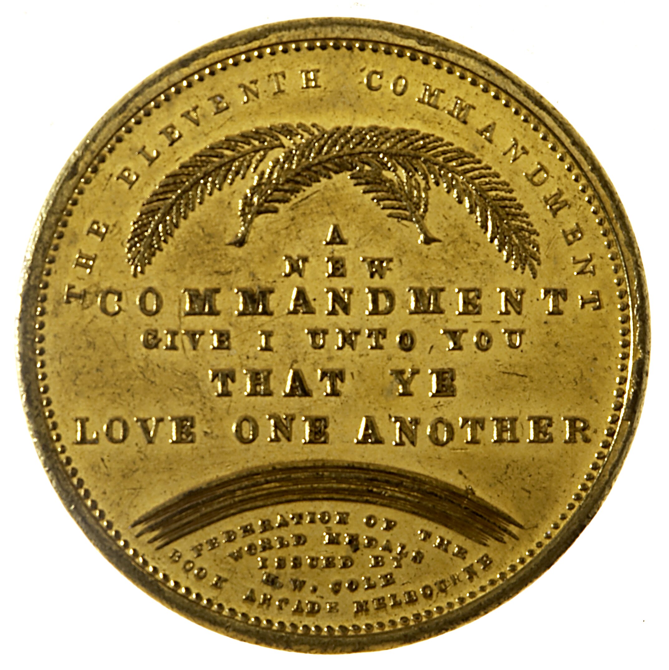 Above two crossed fern fronds, THE ELEVENTH COMMANDMENT; below fronds and above rainbow, A / NEW / COMMANDMENT / GIVE I UNTO YOU / THAT YE / LOVE ONE ANOTHER below rainbow, FEDERATION OF THE / WORLD MEDALS / ISSUED BY / E.W. COLES / BOOK ARCADE MELBOURNE