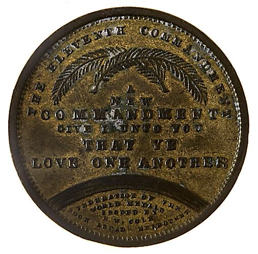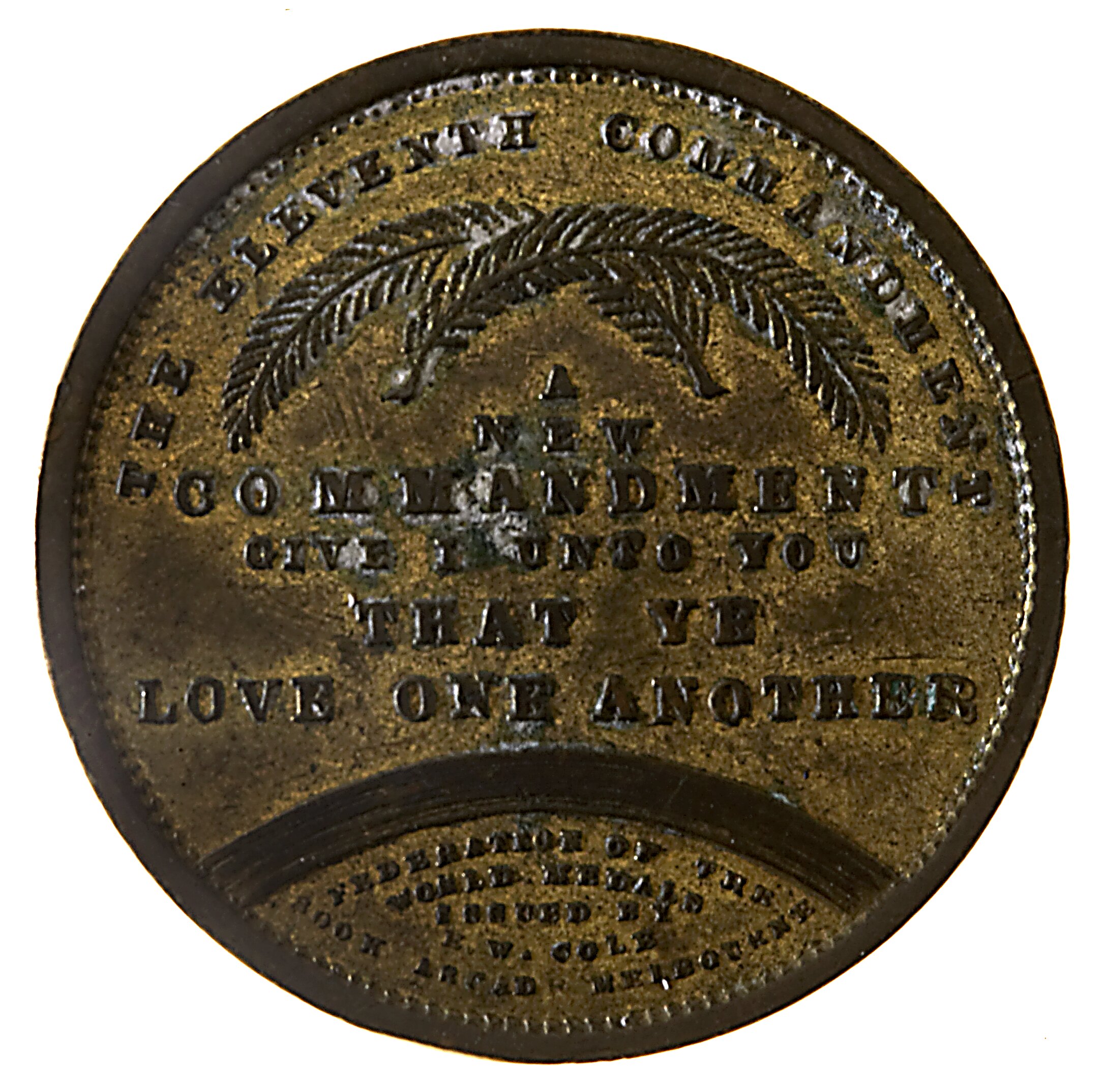 Above two crossed fern fronds, THE ELEVENTH COMMANDMENT; below fronds and above rainbow, A / NEW / COMMANDMENT / GIVE I UNTO YOU / THAT YE / LOVE ONE ANOTHER below rainbow, FEDERATION OF THE / WORLD MEDALS / ISSUED BY / E.W. COLES / BOOK ARCADE MELBOURNE