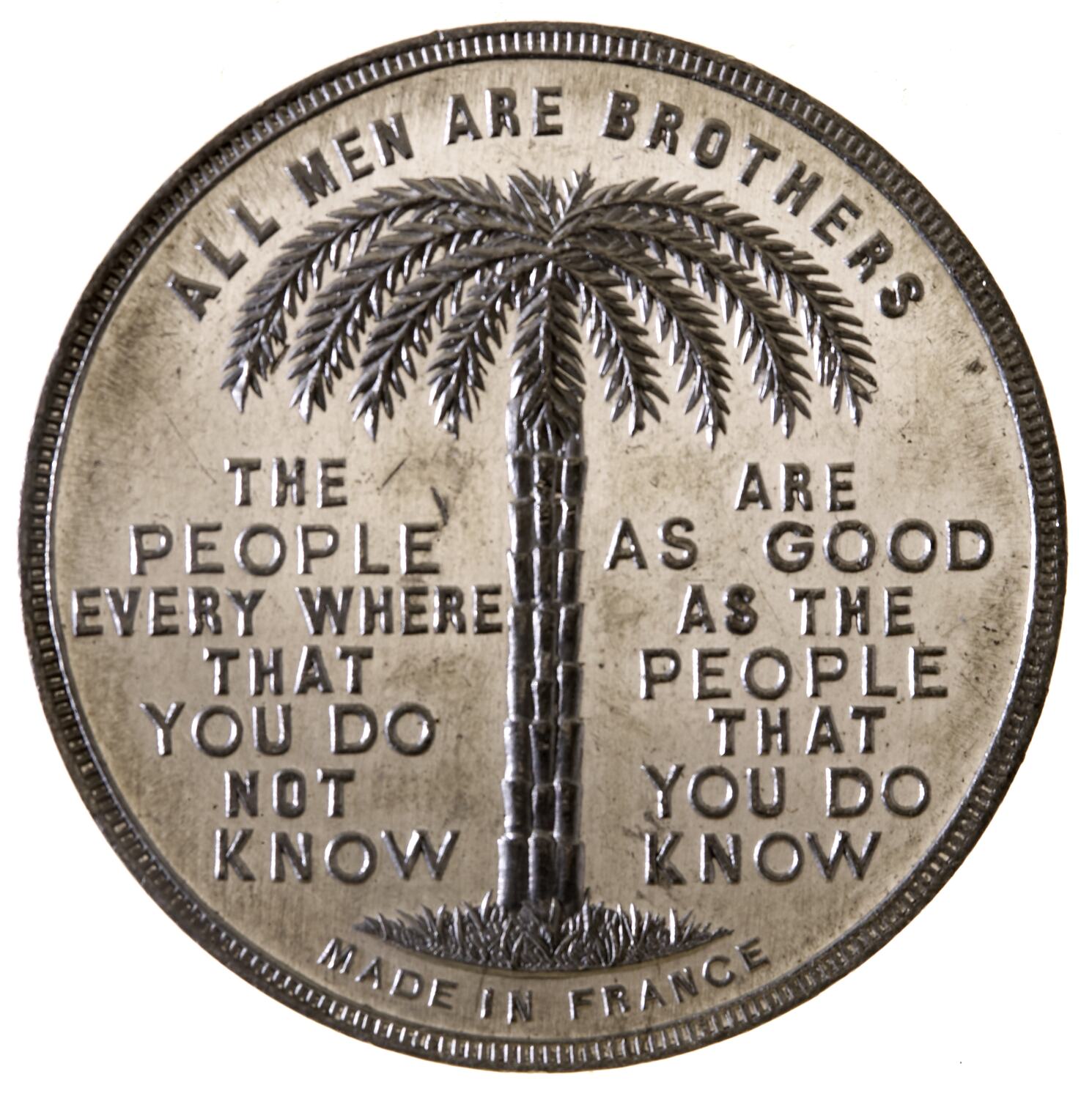 Medal, Cole's Book Arcade Federation of the World, All Men are Brothers, circa 1885. This aluminium medal, made in France, is one of a series of medals offering maxims and proverbs issued by E.W. Cole at his Book Arcade. He called the medals 'little missionaries for the spread of educative knowledge' (Dean, 1988, p.36).