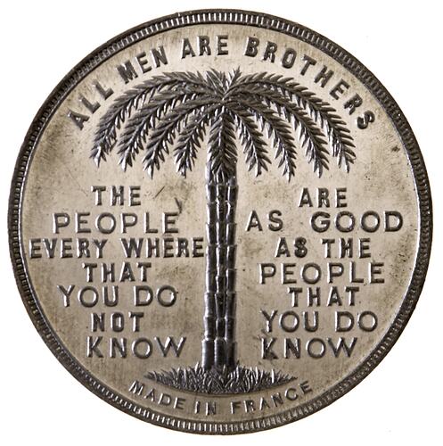 Obverse: ALL MEN ARE BROTHERS THE PEOPLE EVERY WHERE THAT YOU DO NOT KNOW ARE AS GOOD AS THE PEOPLE THAT YOU DO KNOW MADE IN FRANCE Reverse: ACQUAINTANCE ONLY REQUIRED IF ALL MEN THROUGHOUT THE WORLD WERE ACQUAINTED WITH EACH OTHER THERE WOULD BE LITTLE OR NO WAR - FOR THEN ONLY THE VERY WICKED WOULD HAVE TO BE KEPT IN ORDER BY THE WORLD'S POLICE FEDERATION OF THE WORLD MEDALS ISSUED BY E.W. COLE BOOK ARCADE MELBOURNE