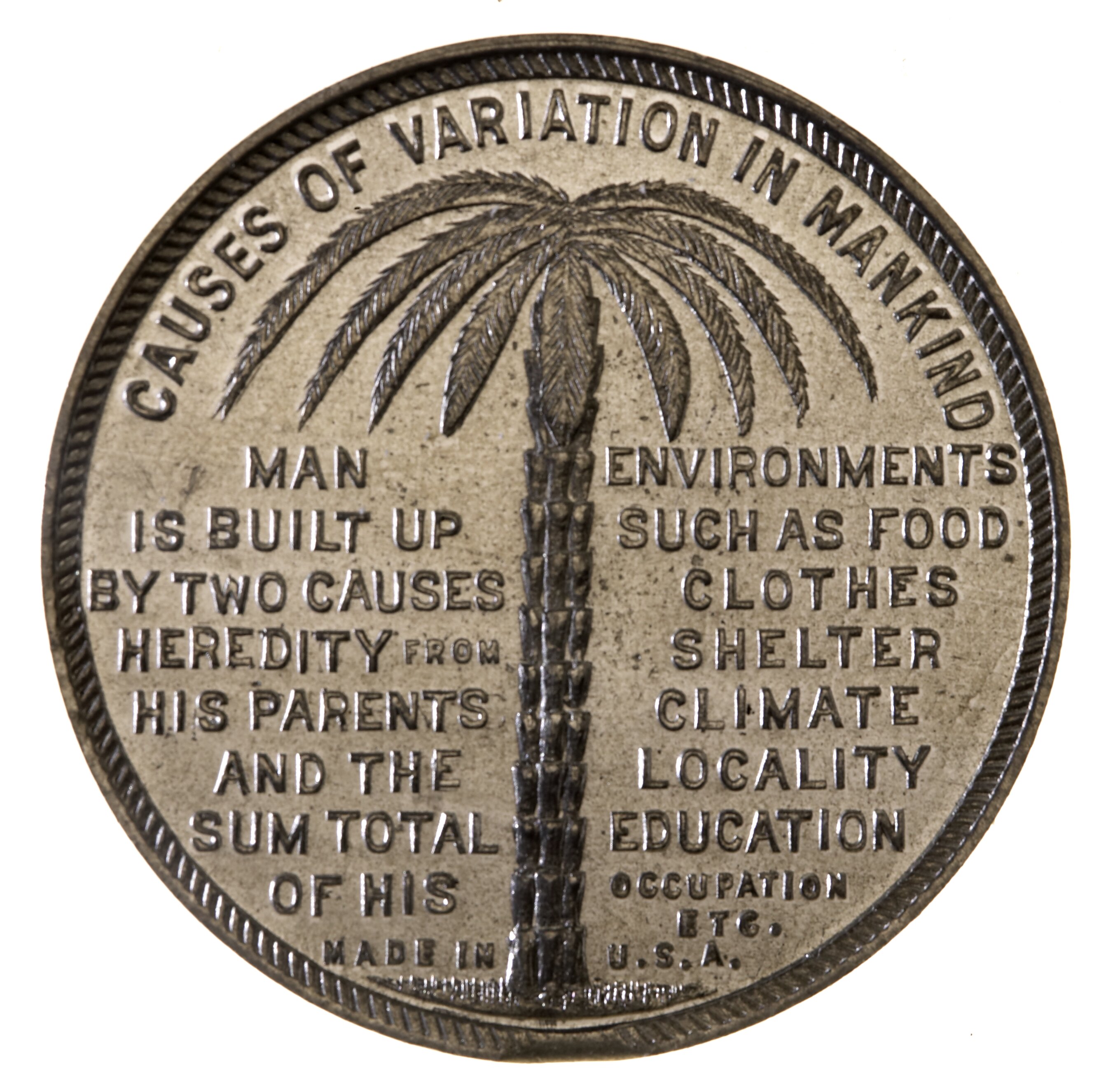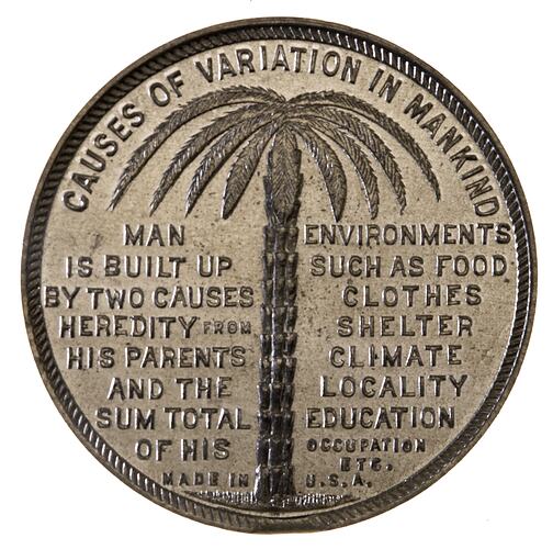 Obverse: CAUSES OF VARIATION IN MANKIND MAN / IS BUILT UP / BY TWO CAUSES / HEREDITY FROM / HIS PARENTS / AND THE / SUM TOTAL / OF HIS ENVIRONMENTS / SUCH AS / FOOD / CLOTHES / SHELTER / CLIMATE / LOCALITY / EDUCATION / OCCUPATION / ETC MADE IN U.S.A. Reverse: HIS SKIN-COLOR / IS CAUSED BY THE / SUN. HE DEGENERATES IN THE ENERVATING / TROPICS. HE EVOLVES / PHYSICALLY STRONGER / IN THE BRACING / TEMPERATE REGIONS FEDERATION OF THE / WORLD MEDALS / ISSUED / BY E.W. COLE / BOOK ARCADE MELBOURNE