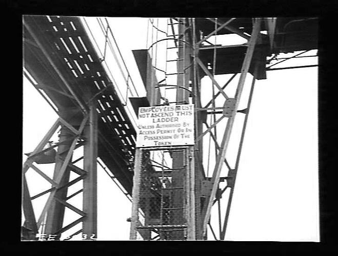Newport Power Station. Warning notices: 'Employees must not ascend this ladder...'.