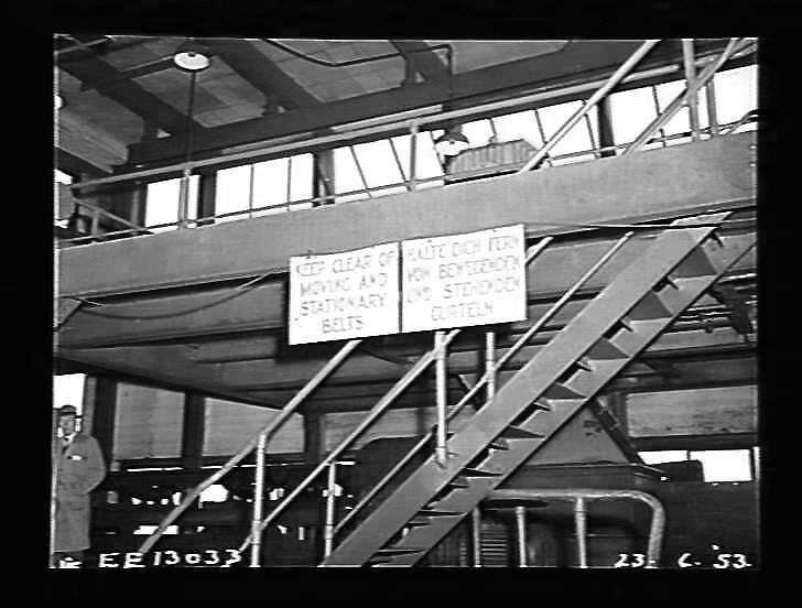 Newport Power Station. Warning notices: 'Keep clear of moving and stationary belts'.