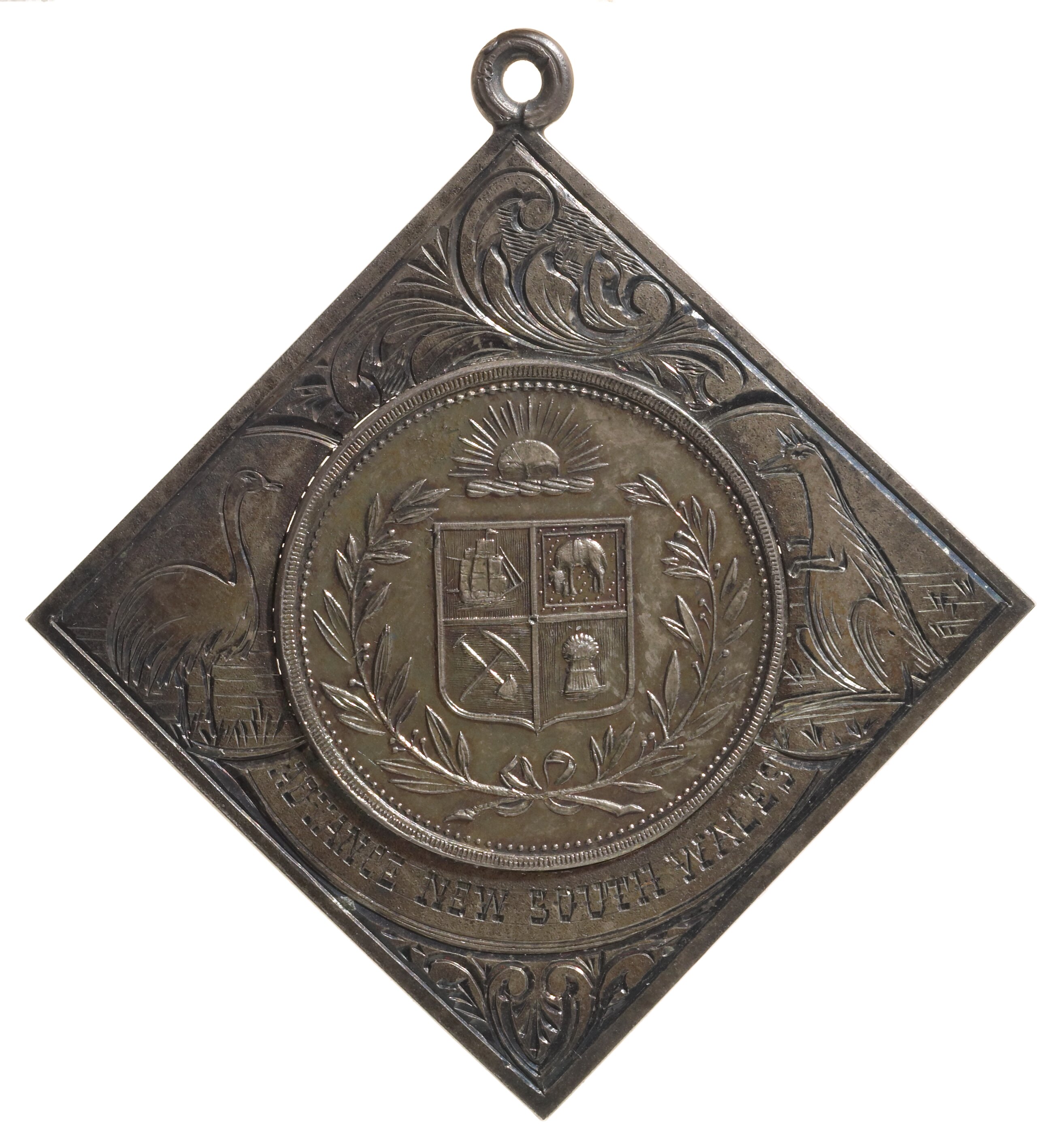 At centre Australian Arms within wreath and below 'rising sun' Engraved on mount, emu and kangaroo supporters; engraved around below, ADVANCE NEW SOUTH WALES