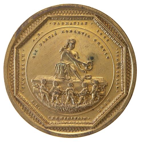 Around inside of octagonal border linked to the medal rim by checker-work, A.D. 1883 . TASMANIAN . . JUVENILE . . INDUSTRIAL . . EXHIBITION . A.D. 1883 , at centre within a line circle, Hobart crouching on an altar, before which five children dance, presenting a victor's wreath the the first child; around above SIC FORTIS HOBARTIA CREVIT